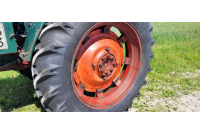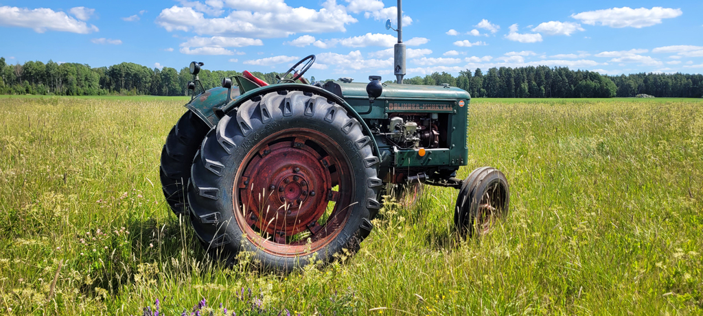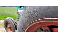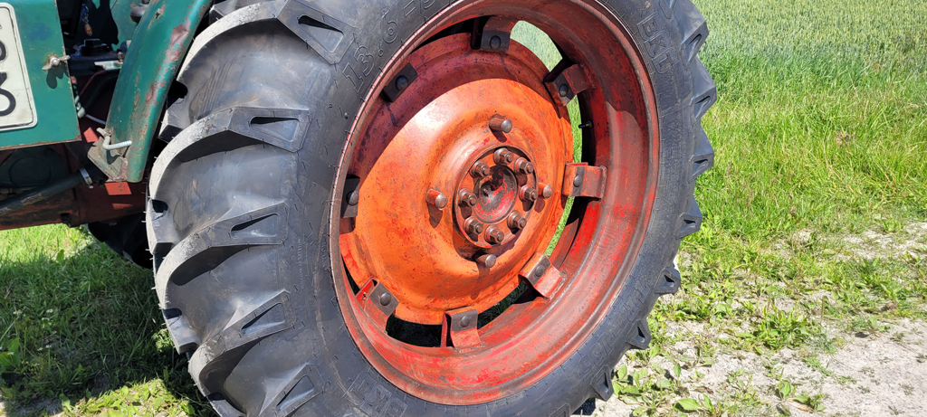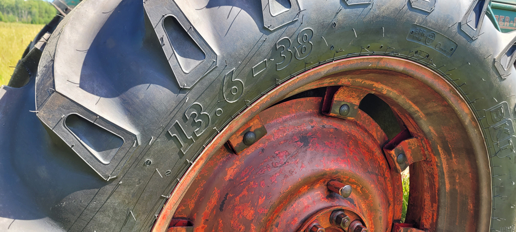 Men nu var det alltså dags för ett par nya däck bak på traktorn. Valet föll på BKT 13.6-38 vilket är en dimension eller profilstorlek större än original. Original såldes traktorn med profilen och storleken 12.4-38. Anledningen till de lite större däcken, är helt enkelt för syns skull berättar Pelle. Det ser helt enkelt lite maffigare ut, och skärmarna fylls ut fint. Andra traktormodeller som använder 38 tums däck på bakhjulen är t.ex. Volvo BM Boxer 350. Fram sitter det 6.00-19 original på BM36. Även framdäcken har är utbytta, och nu är det BKT 7.50-18 monterat istället Mönstret är det klassiska traktormönstret, som heter TR135 för BKT. Däcket är uppbyggt med 8 lager (PR).