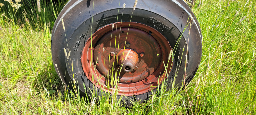 De gamla fälgarna slipades, riktades och målades med rostskyddsfärg på insidan. Alla vassa kanter rundades av. Fälgkanterna brukar vara stötta mot sten på åkrarna, men dessa brukar gå att snygga till med mothåll, hammare och stor skiftnyckel. Allt detta gjorde att de nya däcken var mycket lätta att montera själv. Naturligtvis byttes även slangarna samtidigt, en billig åtgärd för att minimera framtida kostsamma punkteringar. En god vän hjälpte till med monteringen, och det räckte med två däckjärn samt däckmonteringspasta. Det finns en däckmonteringspasta som är anpassad för traktordäck. Den tar lite längre tid på sig att torka, vilket är bra då det brukar ta lite längre tid att montera ett traktordäck, jämfört med t.ex. ett bildäck.