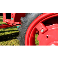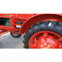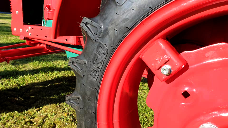 Naturligtvis har traktorn fått nya däck runt om. Man ville ha samma profil på däcken som det var original på traktorn, vilket innebär 9.5-28 bak och 5.00-15 fram. Med fälgtallriken monterad för smal spårbredd, blir resultatet mycket stilrent och tilltalande med de smalare däcken.